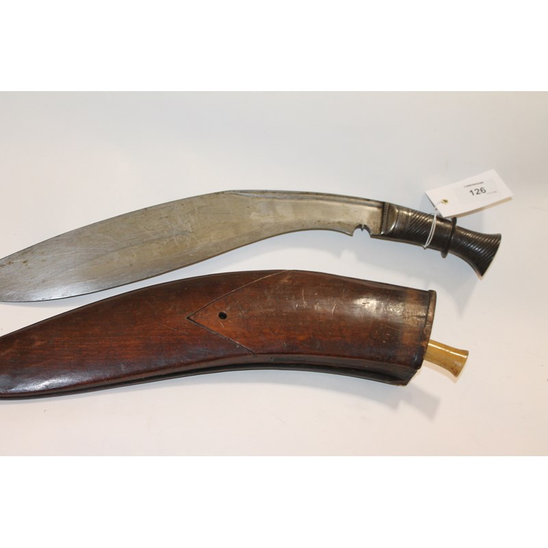 An unusual Kukri with metal swirl grip hilt and carved wooden scabbard. The scabbard with Oyster shell decoration is in two pieces, possibly the glue having broken down, also contains one bone handled skinning knife. An unusual natives dagger with slim 9" blade and three-toed pommel, in a wooden scabbard.