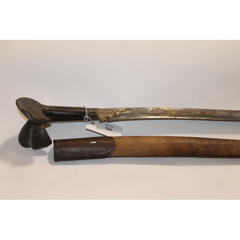 A YATAGAN SWORD. A Yatagan sword with wooden flared pommel, brass mounts with 23.3/4" blade. Some light decoration to the blade, complete with a wooden scabbard lacking its leather covering.