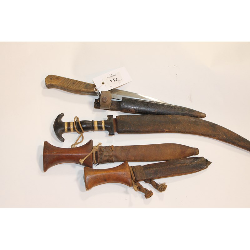 A German Gt War period Trench Dagger, complete with its metal scabbard. 5.3/4" spearpoint blade with reverse quillion guard, wooden two piece grip with frog present. Also three North African tribesman daggers/knives of poor quality. (4)