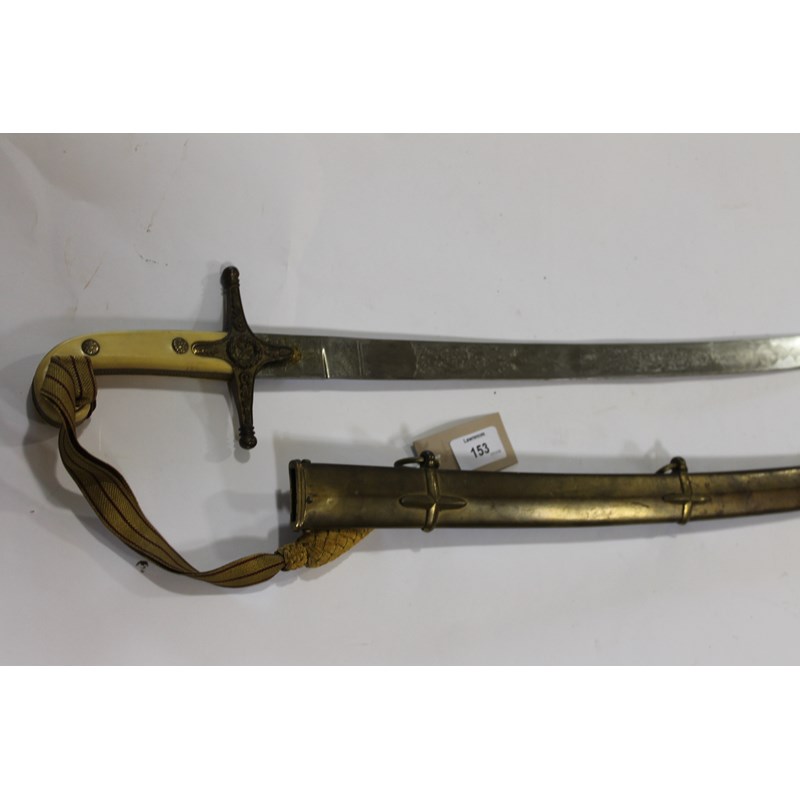 An 1831 pattern General Officers Mameluke sword and brass scabbard. Very clean 33.1/2" swept blade, with Victorian Crown amid stippled foilage, Complete with sword knot of red and gold.