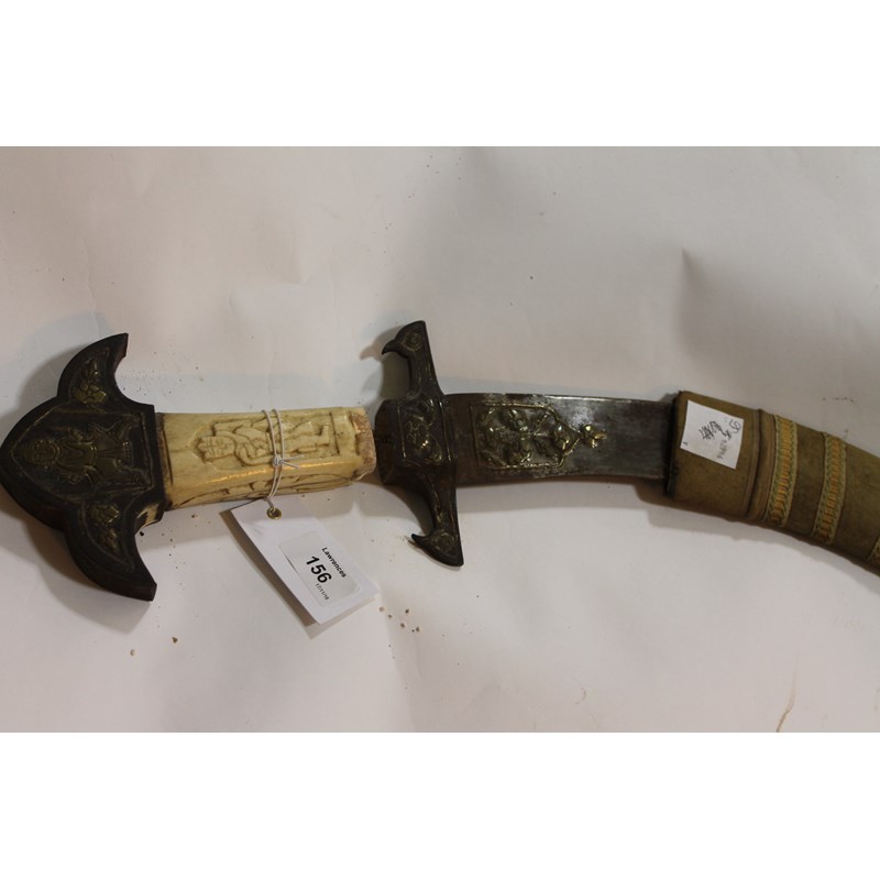 A heavily constructed large Indian ceremonial Dagger with carved bone hilt and brass decoration. Complete with a scabbard of covered wood, with 11.1/2" Khanjar style ribbed blade and an overall length of 19". Handle needs re-fixing to the hilt, the original glue having broken down.