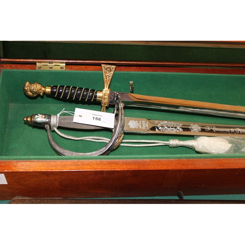 A Wilkinson sword made to celebrate the wedding of The Prince of Wales and Lady Diana Spencer in 1981. Another by Wilkinsons in the style of a Scottish Broadsword with undress hilt. A brace of left handed daggers, with wooden grips and brass pommels, etc.