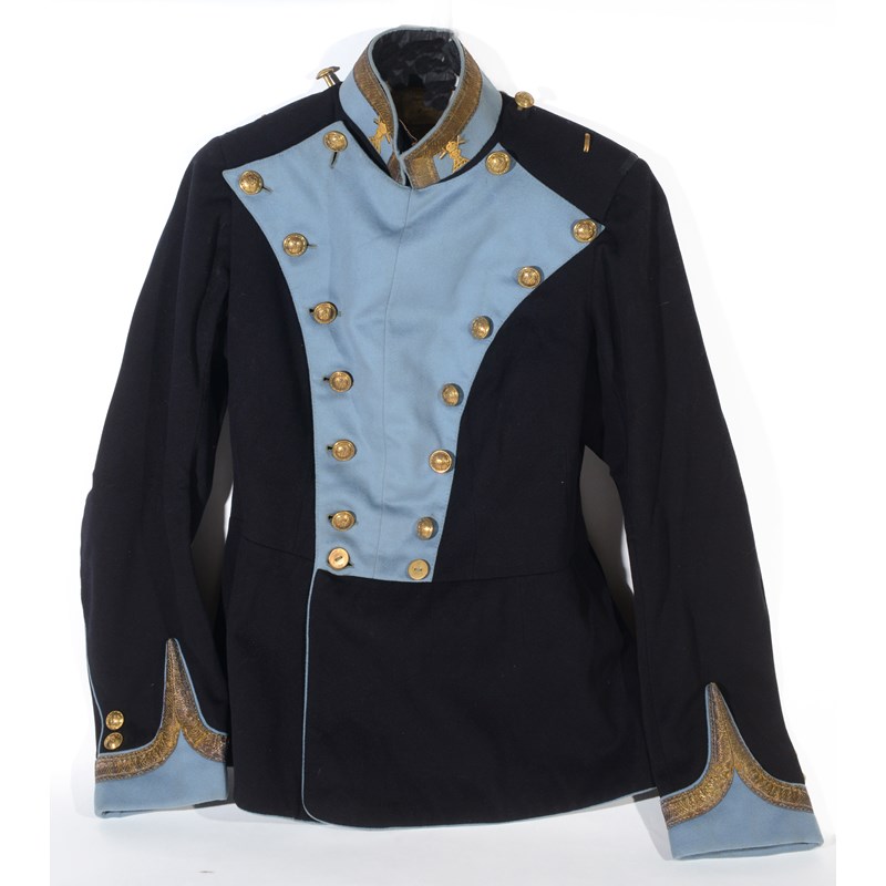 A 21st Lancers tunic with plastron front, with Kings Crown buttons and collars. The jacket in very good condition as are the fittings, including the gold bullion cuffs. The chest measurement approximately 34" with a partial makers label inside for Sandilands & Son.