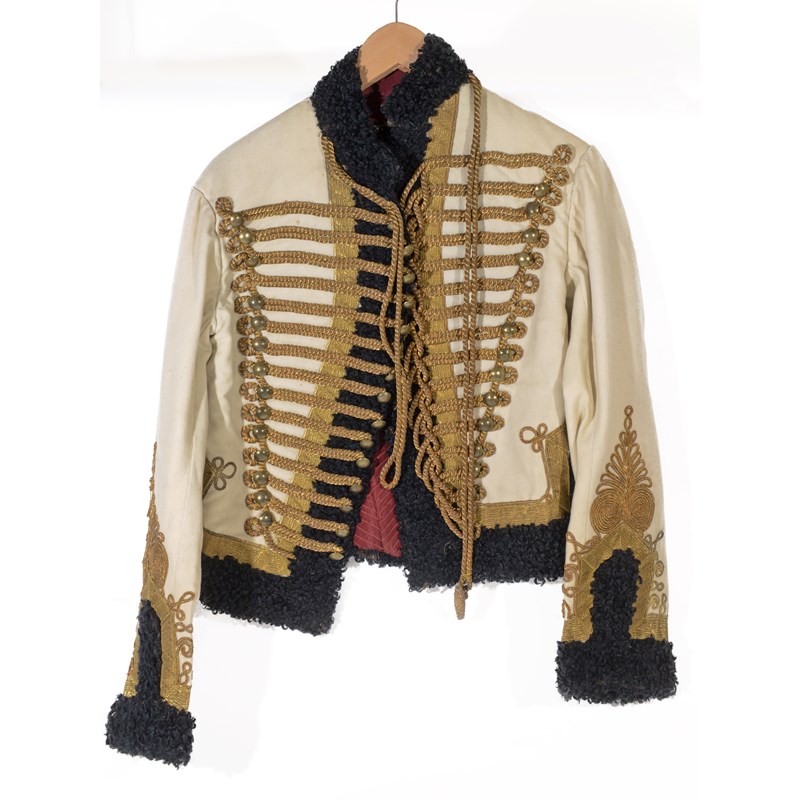 A Continental Lancers or Hussars Officers coatee with Astrakan cuffs and collar. In a light beige with gold bullion decoration, plain buttons and makers label of Auguste & Cie, Costumiers de Paris, 27 Wellington Street, London, WC. The reverse of ornate braid decoration, the lining of red material, approximately 34" chest.