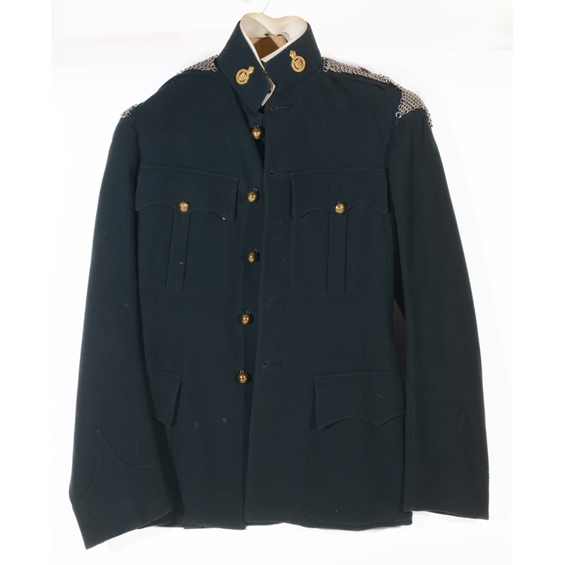 A green Essex Yeomanry patrol tunic with Kings Crown buttons and collar badges. Chainmail epaulettes with gilt buttons, size 36" approximately. A Mess Dress coatee with buff waistcoat and uniform trousers, gold bullion lapel badges. A 9th Lancers Mess Dress jacket, by Rogers & Co or Rogers & Jones etc of Burlington St London.