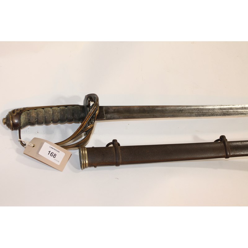 A brass hilted officers sword with VR cypher inset, also VR under a crown on the 33" single-edged blade. Marked Maynard Harris & Co, Leadenhall St, London EC on the blade, complete with a steel scabbard. The hilt is misshapen requiring straightening/repair etc.