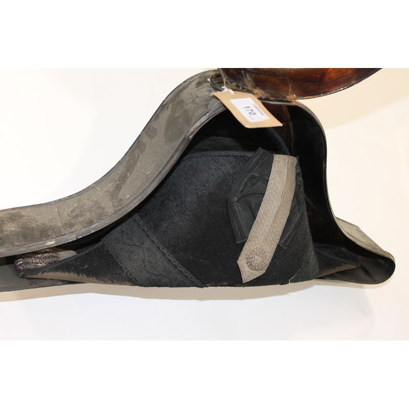 A Diplomats hat in the fore & aft style with single bullion decoration present. In its protective black 'Jappaned' fitted tin case, late 19th or early 20thC style.
