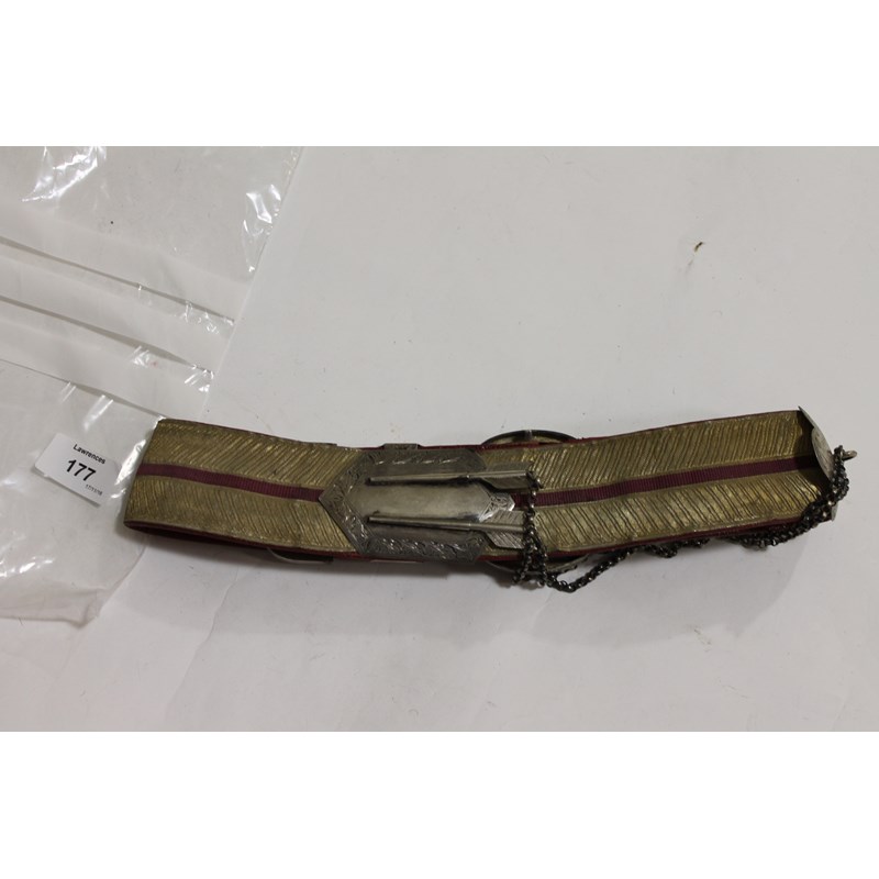 In red leather with bullion decoration, the fittings marked Ranken & Co under a rampant lion. Boss and chains with two prickers, all in silver coloured metal.