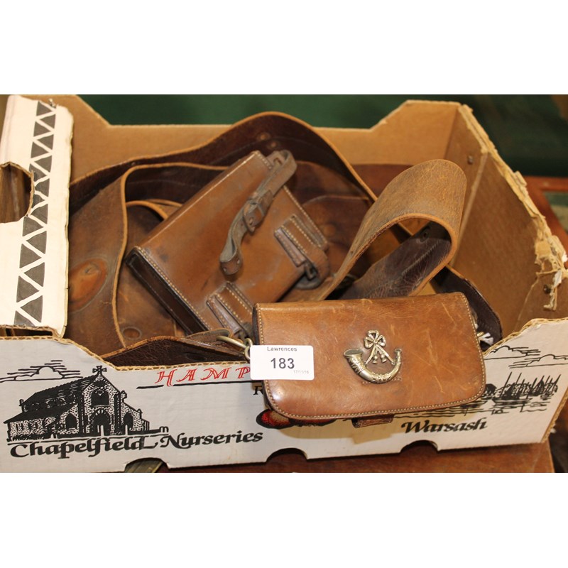 PARTIAL SLI SHOULDER BELTS. Three brown leather shoulderbelts with pouches bearing the Light Infantry Bugle badge, lacking plates and attachments. Also an associated pouch, possibly a private purchase type.