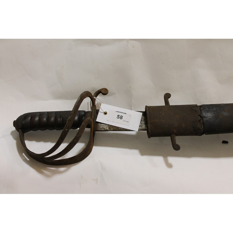 A Sword and partial scabbard based on the 1796 Light Cavalry pattern. Three bar hilt with carved wooden grip, 30.1/4" single-edged curved blade, with three-quarter fulers. Partial wooden scabbard with traces of leather covering, with steel mounts. Rust to both blade and mounts evident, no visible markings evident.