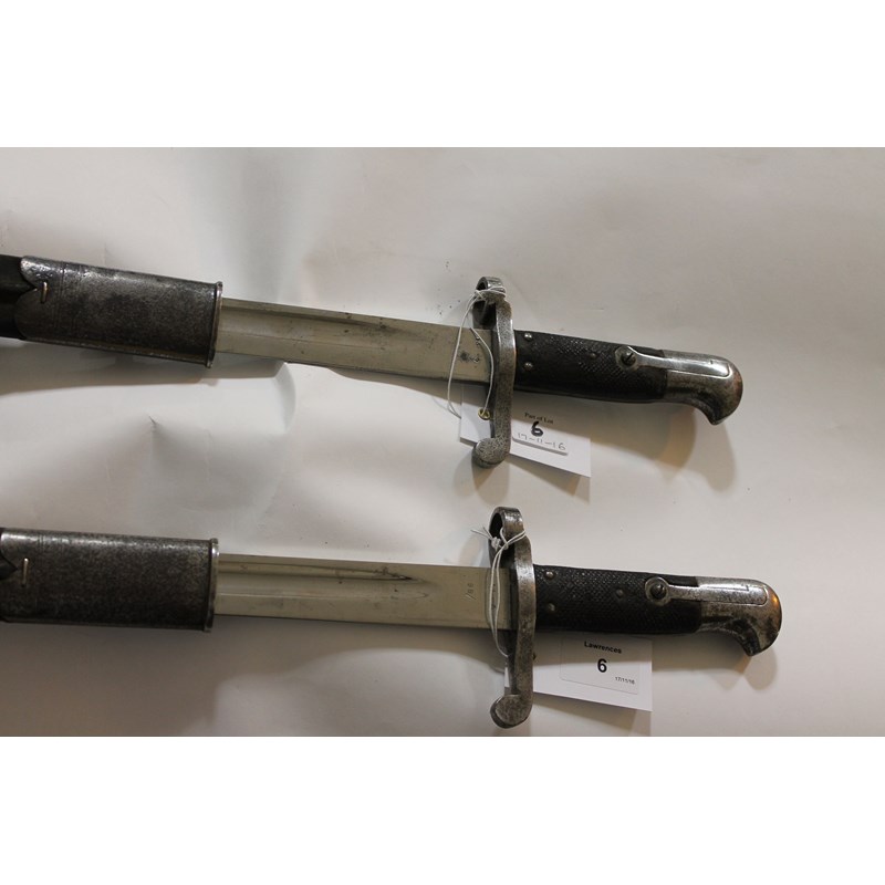 Two 1888 pattern British Sword Bayonets, complete with steel and leather scabbards. Mk 1V types with various markings to blades and hilts, including WD stamps on the very clean blades.