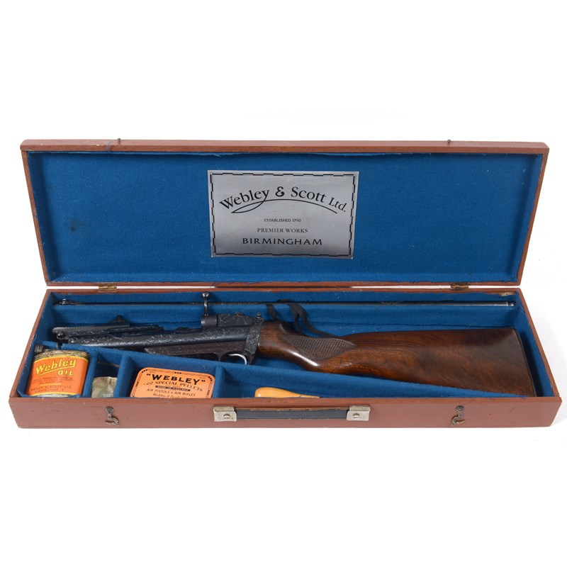 A wooden cased Webley Mark 11 Service Air Rifle, with both barrel and rifle numbered S11055/11055. With partial foilage engraving to the barrel, the action itself is almost fully engraved. Amid the foilage in an wavy scroll is Webley Service Air Rifle Mk 11. The engraving appears to be of a very high standard, perhaps a presentation or one off piece. A Webley oil can and pellet tin, tools etc are included in the lot.