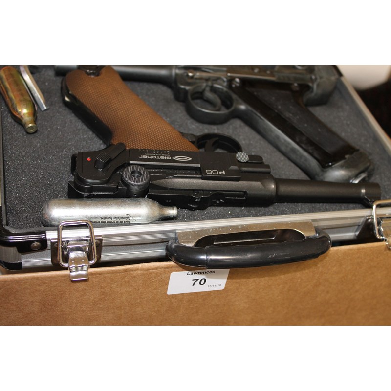 A Co2 Air Pistol in .22 caliber, in a Luger style. Complete with over (70) unused Co2 gas cartridges and tinned pellets. A a Luger styled .177 Air Pistol, by Gletcher.