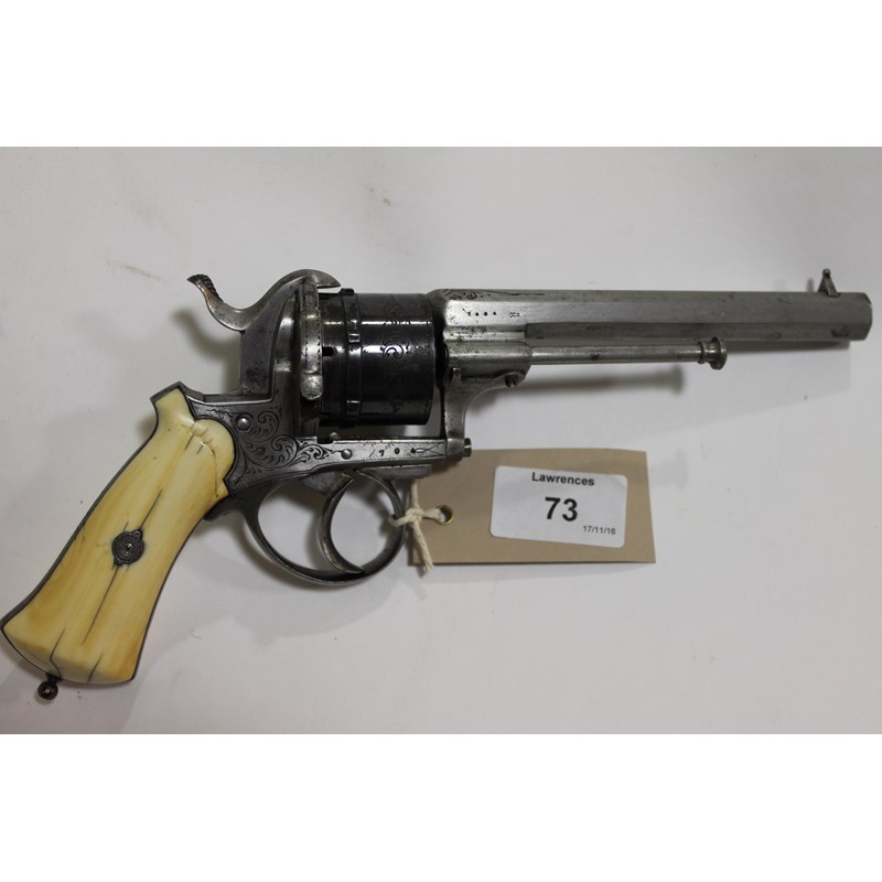 A continental pinfire revolver with partially engraved steel frame and furniture. An octagonal 5" barrel with side mounted ramrod, white horn grips and numbered 704 in apparent working order.