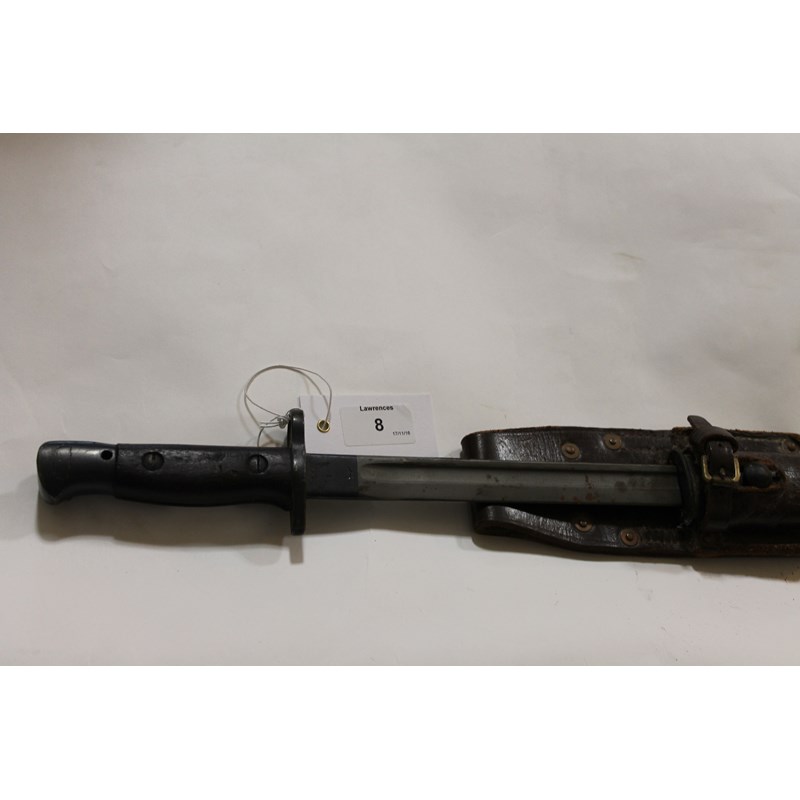 A 1907 Sanderson made Bayonet with many stampings on the blade, with straight quillion. Complete with scabbard and a brown leather frog with broad arrow mark in an inverted U.