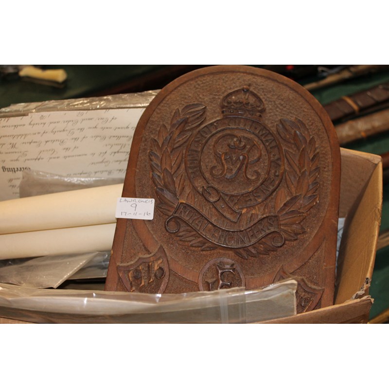 Various papers and military booklets, regimental crest and wooden Re carved plaque. Five Regimental Xmas Cards including The Royal Scots, The Border Regt, RMC, Gordon Highlanders, Irish Guards etc.