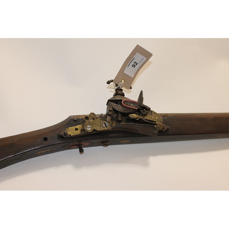 A well made flintlock action Jezail rifle, of the 19thC. The 52" barrel is of octagonal form with front and rear sights fitted. The stock is inlaid with wire patterns and bone plates, also a bone buttplate. Fitted with an interesting lock and action, with gilt scroll decoration. 67.1/2" overall length.