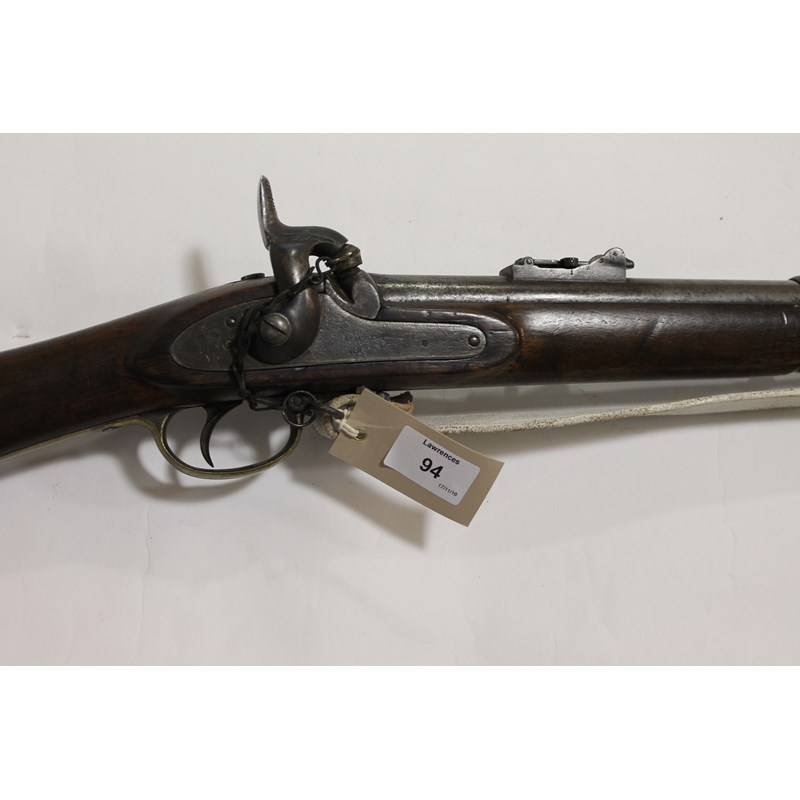 A three-band Enfield pattern rifle 1853 model dated 1862 with Tower mark, also Crown over VR on the lockplate. Complete with a capchain and steel ramrod, with bayonet and scabbard affixed. 39.1/2" barrel with bayonet fitted the overall length is 73.1/2"