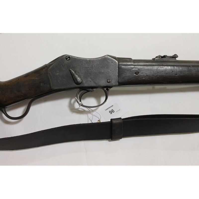 A Matini-Henri carbine with Crown over a faint VR then Enfield, 1885 and 11. The barrel length of some 20.3/4", with steel ramrod below. The bayonet fitted complete with a leather and steel mounted scabbard, is an 1856 pattern sword bayonet. The length with the bayonet fitted is 60.1/4".