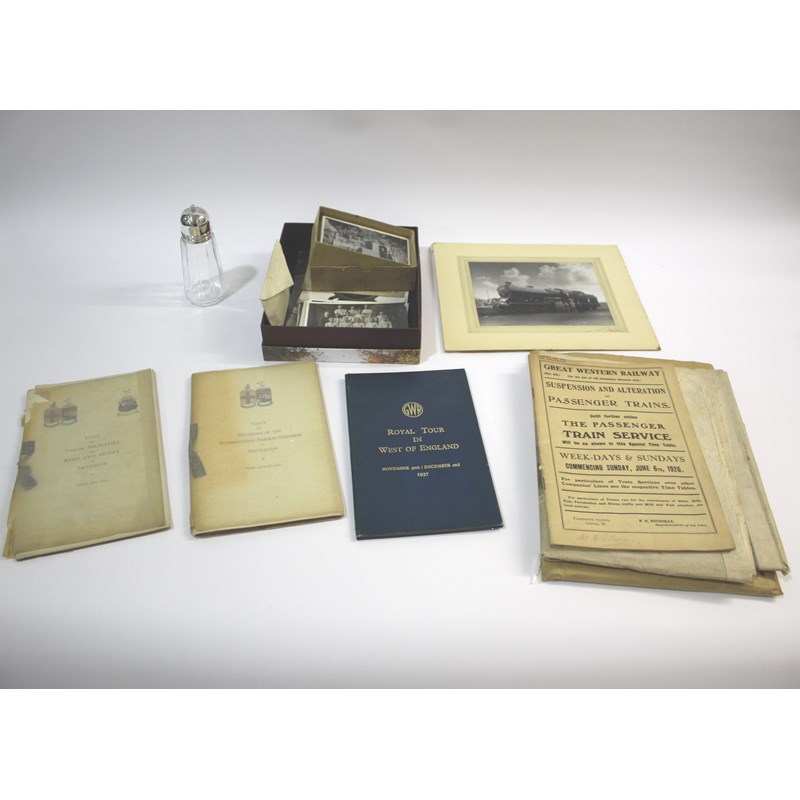an interesting mixed lot including a GWR Royal Tour in West of England 1937 booklet with timetable inside, Visit of Their Majesties and King and Queen to Swindon 1924, and Visit of Members of the International Railway Congress to Swindon 1925, GWR Suspension and Alteration of Passenger Trains 1926, BR Funeral of King George VI 1952 and typed letter, etc. Also with a signed photograph of the locomotive Zeebrugge, various Railway postcards etc.