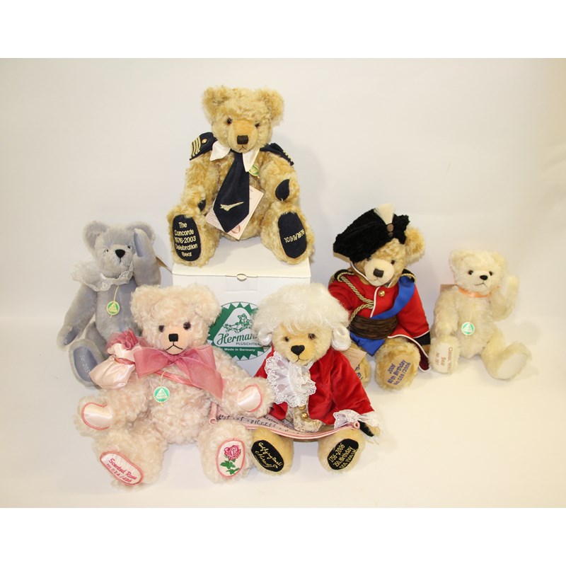 including one boxed Bear Concorde Celebration Bear (with box and certificate). Also with 5 other Bears including Water Princess 2004 (musical), Scented Rose, Wolfgang Amadeus Mozart, Queens 80th Birthday 2006, and Classic White Bear, with certificates but no boxes. (6)