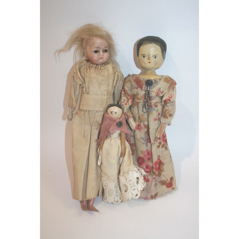 a wax over composition head doll, with fixed brown eyes and wooden limbs. Also with two 19thc wooden dolls. Wax Doll 12 1/2ins (32cms) high. (3)