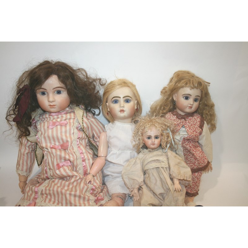 4 reproduction bisque head dolls in the manner of Jumeau, including one dated 2010 and signed Denise D, one dated 2011, and two other similar dolls. Also with various other dolls.