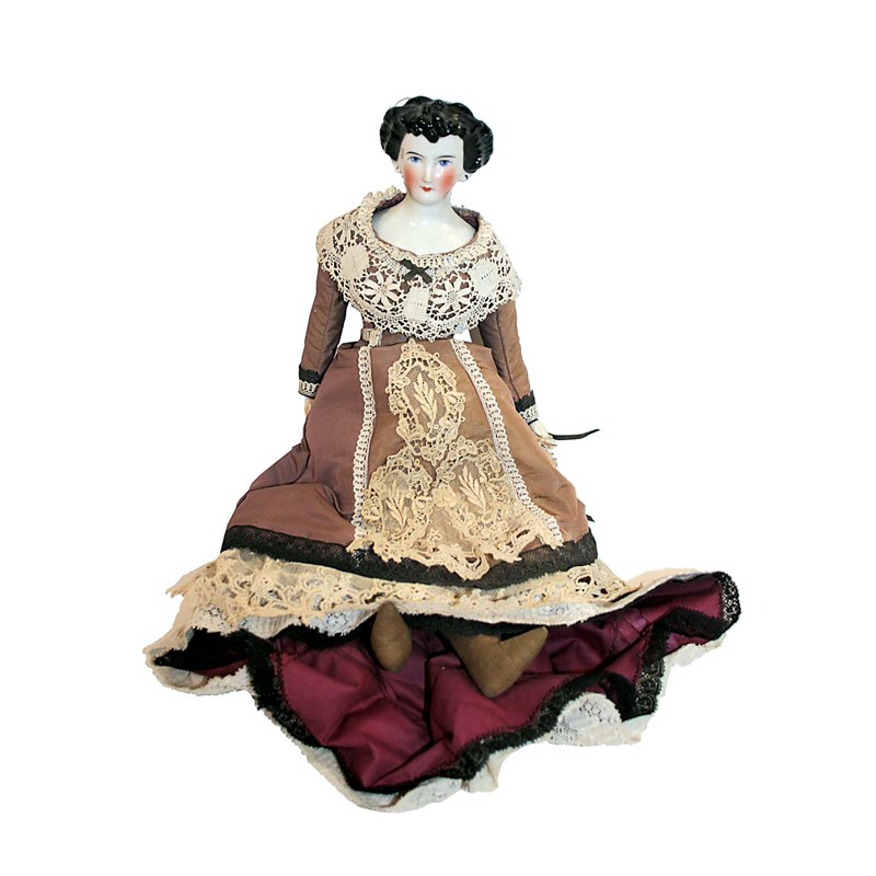 with moulded hair, pierced ears and painted face. With porcelain arms and in a contempory dress, possible restoration to the shoulder plate. 15ins (38cms) high