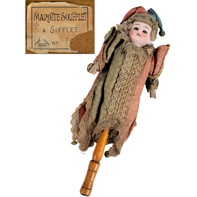 the bisque head with fixed blue eyes and open mouth with teeth, mounted on a wooden shaft with squeaker mechanism (not working), the costume with lace trimmings and bells. In it's original box with label on one end, Marotte Soufflet, A Sifflet, Francais. 13ins (33cms) long overall