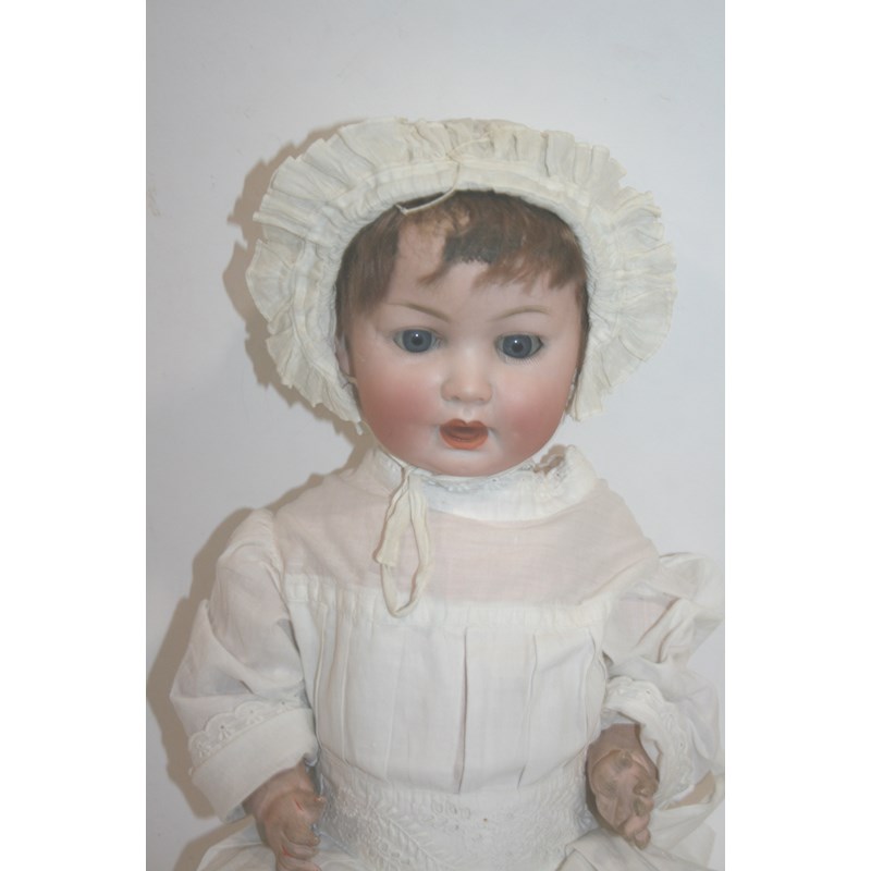 with weighted blue eyes, open mouth and bent limb body. Impressed marks, PM (Porzellonfabrick Mengersgereuth), 914, 8. 17ins (44cms) high