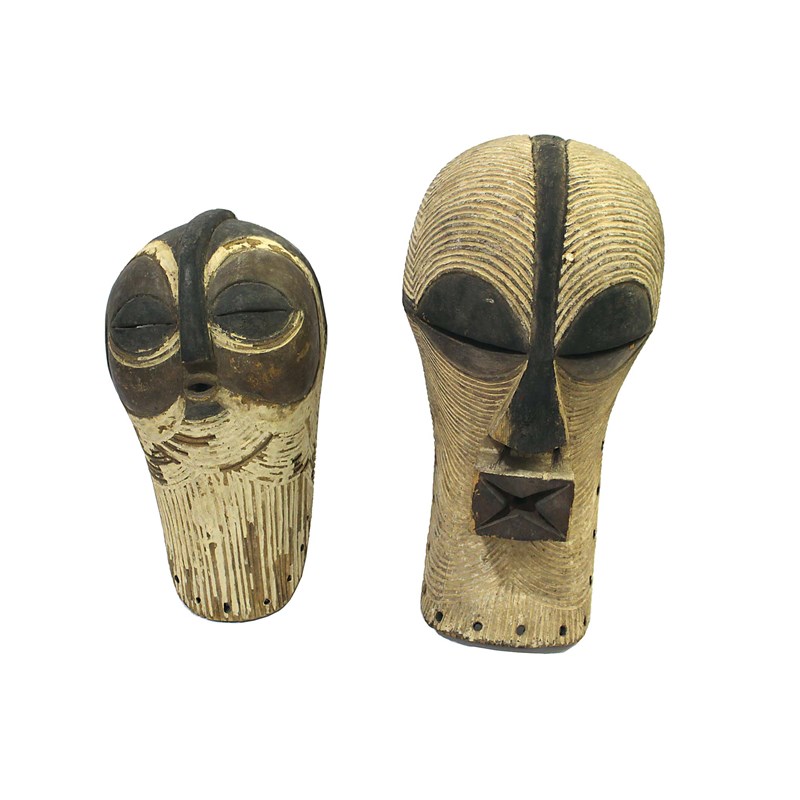 TWO AFRICAN TRIBAL MASKS - SONGE the two wooden masks painted and with pierced holes around the edge of the masks. Made by the Songe people, Congo. Largest 48cms high (2)