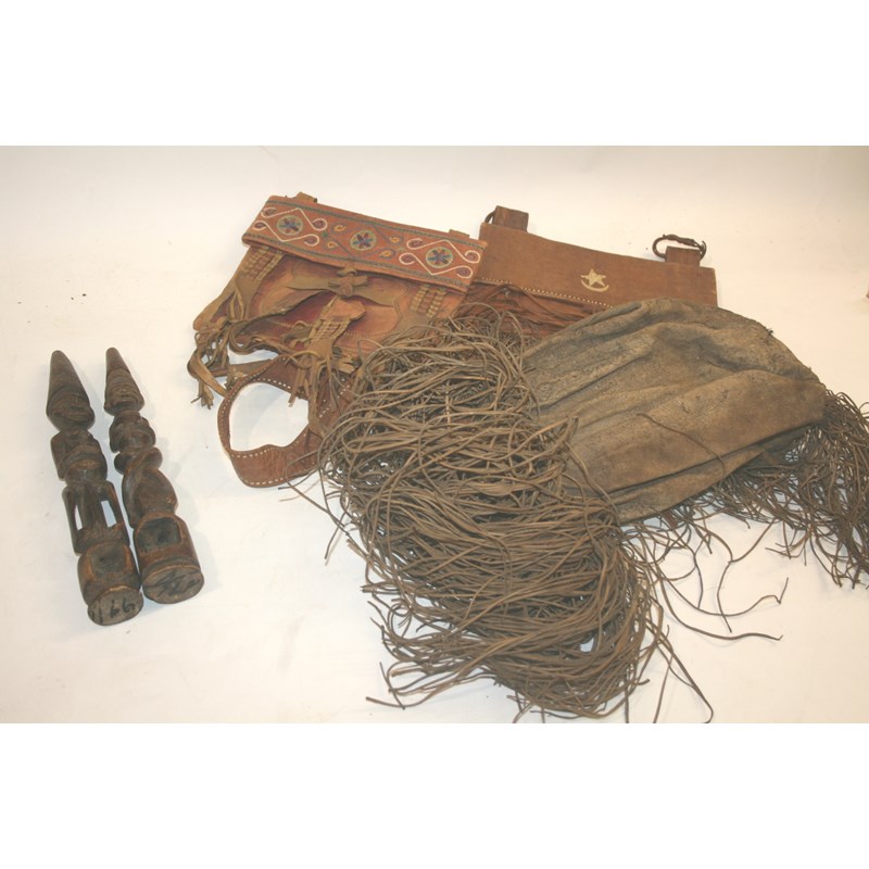TRIBAL PIPES - NIGERIA 2 tribal pipes carved with faces, also with 3 North African bags. (5)