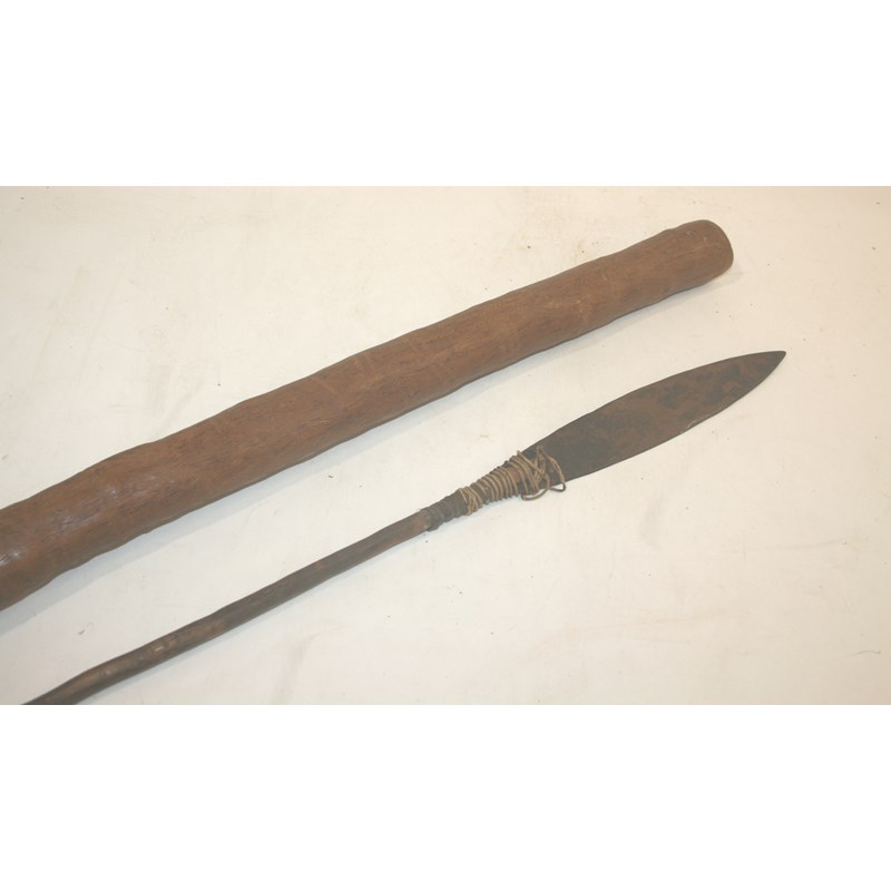 ABORIGINAL DIDGERIDOO an interesting Aboriginal Didgeridoo, with incised decoration along the shaft. Also with a spear. Didgeridoo 116cms long. (2)