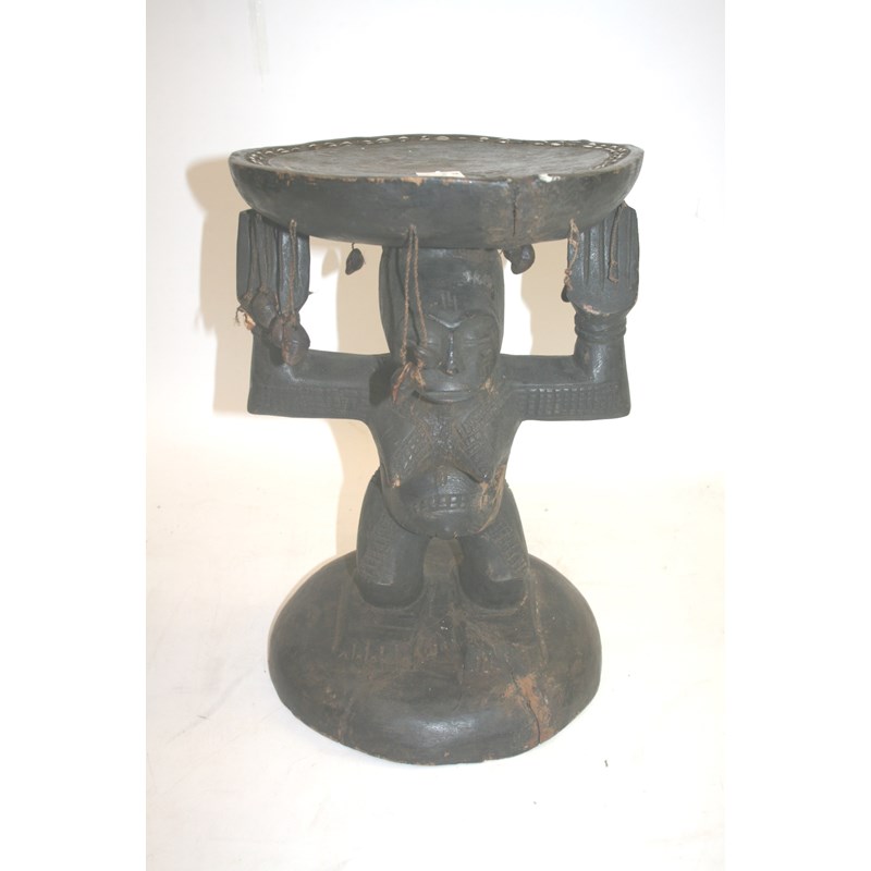 TRIBAL STOOL - HEMBA a tribal stool in the form of a female figure, the top inset with shells and with nuts hanging from the rim. From the Hemba region in Zaire. 45cms high