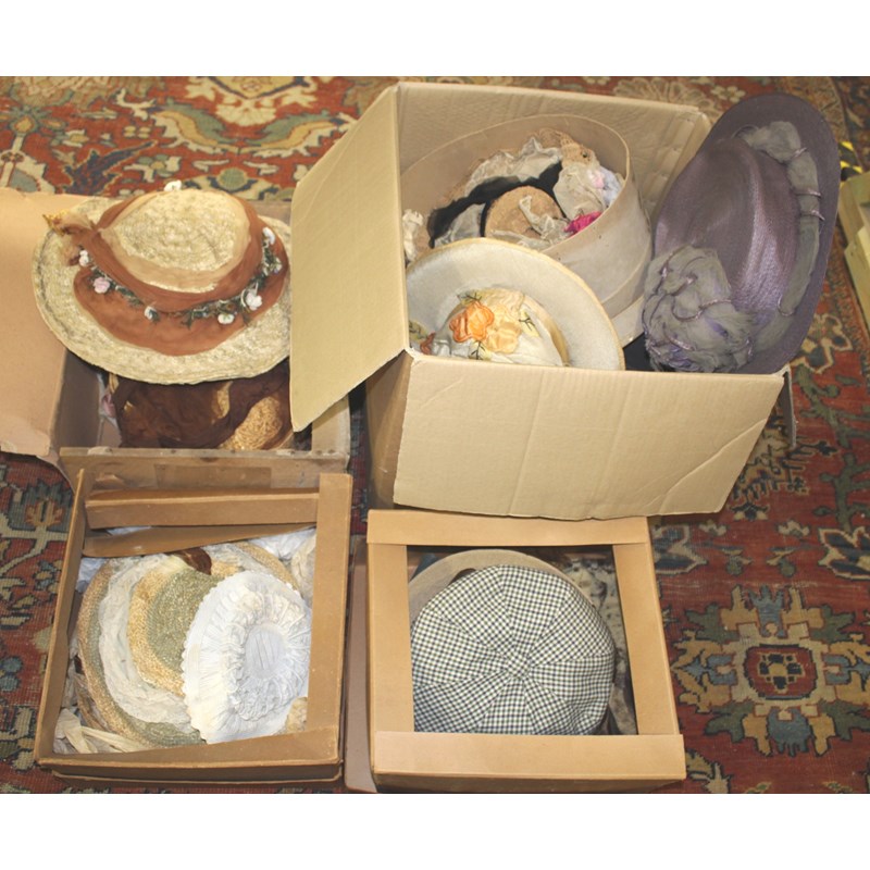 VINTAGE HATS mostly from the early 20thc including wicker and material examples, some embellished with lace trims and embroidered flowers. Also with a vintage Hat Box, with a label for Thorne & Thorne, Shepton Mallet.