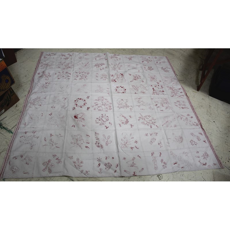a 64 square enbroidered Friendship quilt, the panels with depictions of people, birds and animals, flowers etc. Some of the panels with initials, and dated 1889.