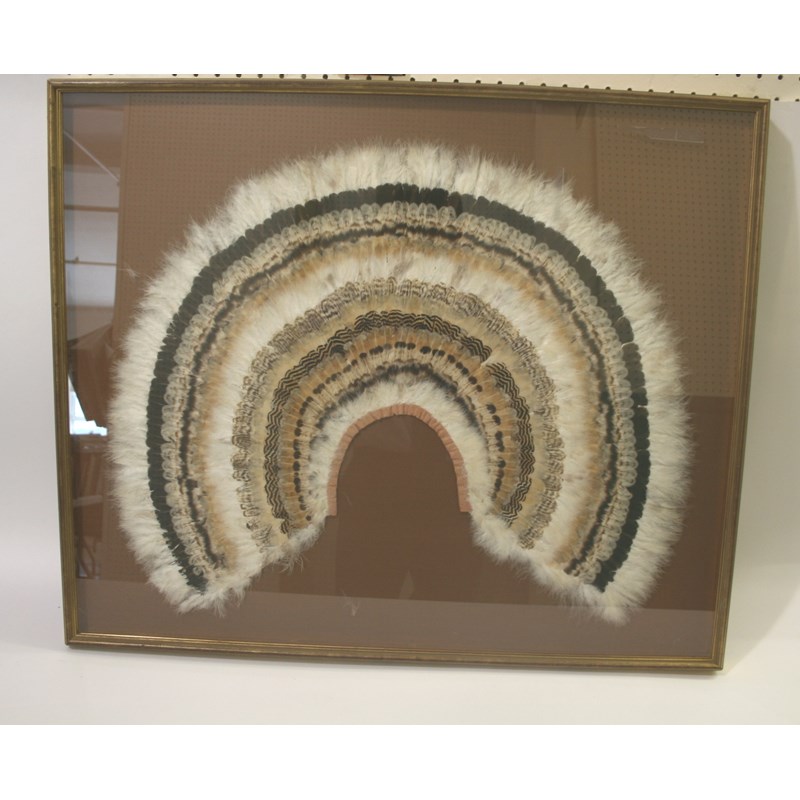 an elaborate Hawaiian feather cape, mounted in a case. Probably made in the mid 19thc. Case 83cms by 70cms