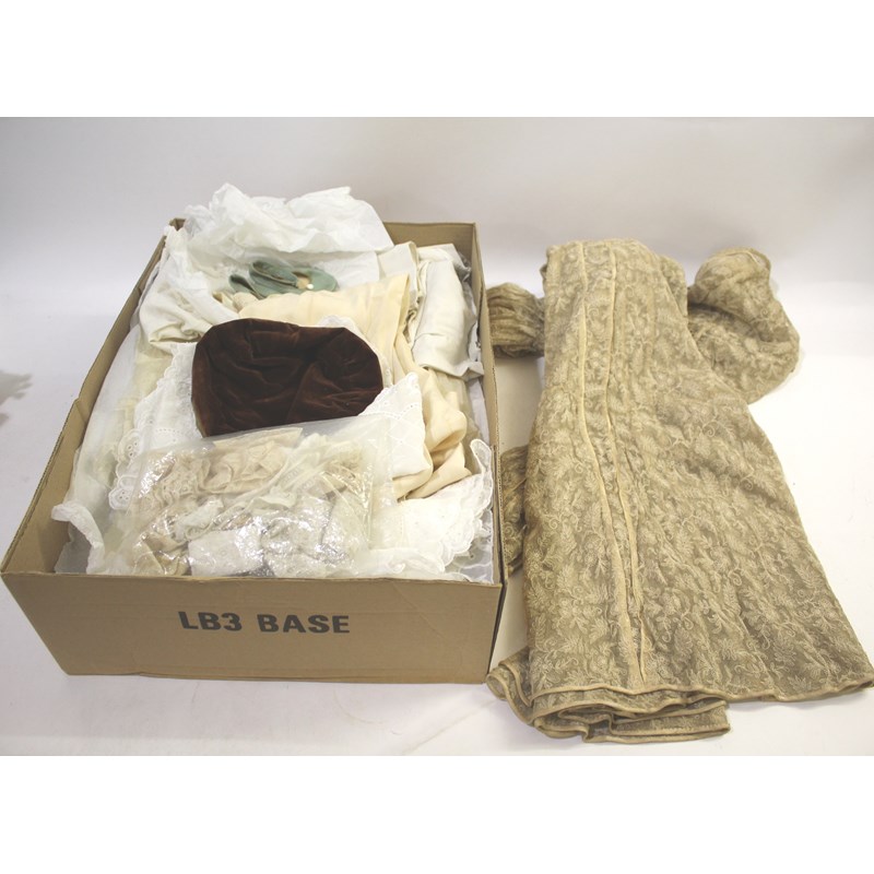 an interesting mixed lot including a machine made lace dress and jacket, and silk petticoat, circa 1920's. Also with a qty of vintage children's clothes, embroidered net and silk gowns, trimmings, pair of baby shoes etc.