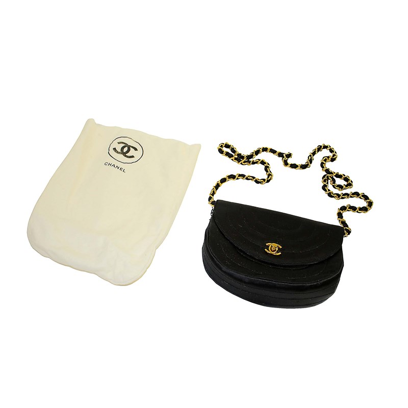 a late 1970's/early 1980's Chanel evening bag, the black quilted bag with chain strap and interlocking Chanel motif and clasp. With an identification card, No 0204238, and with a Chanel cloth bag. Bag 19.5cms across