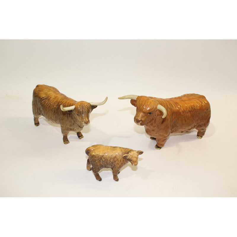 BESWICK HIGHLAND BULL, COW & CALF including Model No 2008 Highland Bull, 1827D Highland Calf, and 1740 Highland Cow (tip of one horn chipped). (3)