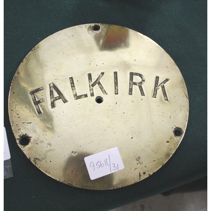 ENGINE PLATE - FALKIRK a brass circular engine plate with 4 pierced holes, and marked Falkirk. 21.5cms diameter