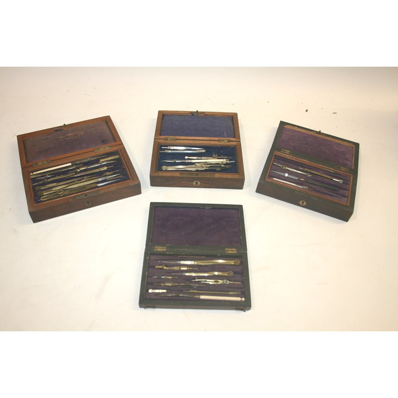 4 Rosewood cased antique geometry sets, including one set by Compas Superieurs with two layers, one cased set with an owners name plaque in the lid, and two other sets. (4)