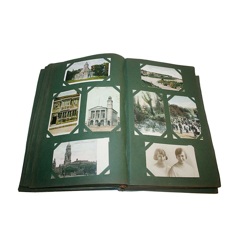 a large album with GB content (Portsmouth, Southsea, Oxford Colleges, London, Edinburgh, Taunton St Marys Church, Exeter, Butleigh, Glastonbury, Laxey Wheel, Clifton, Isle of Wight, Teignmouth, and many more. Also with postcards of Canada (Childrens Home & Orphanage, Calgary), South Africa (Durban etc), Dogs and Cats, Actors, Royalty etc.
