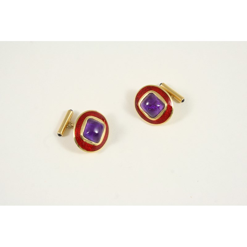 A PAIR OF AMETHYST AND ENAMEL CUFFLINKS each link mounted with a cabochon amethyst within a surround of red guilloche enamel, in gold, with cabochon sapphires set to the terminals.