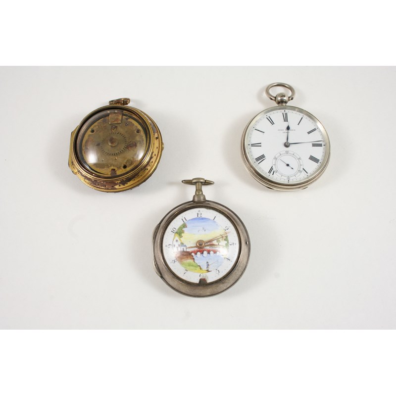 the enamel dial decorated with a scenic view of a man fishing by a bridge, Arabic numerals, hallmarked for London 1878, together with a pair cased tortoiseshell pocket watch, dial missing, and a silver open faced pocket by John Walker, the signed white enamel dial with Roman numerals and subsidiary seconds dial, hallmarked for London 1871, with engine turned and cartouche decoration to the back case, 45mm. dia.