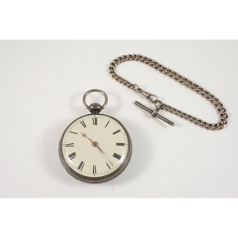 the white enamel dial with Roman numerals, hallmarked for London 1823, the movement signed Geo. Bartlett, London, 50mm. dia., with a silver watch chain.