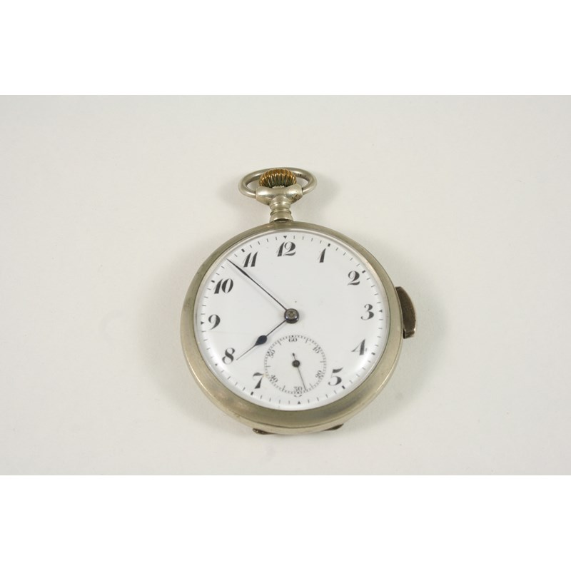 A NICKEL MINUTE REPEATER OPEN FACED POCKET WATCH the white enamel dial with Arabic numerals and subsidiary seconds dial, 50mm. dia.