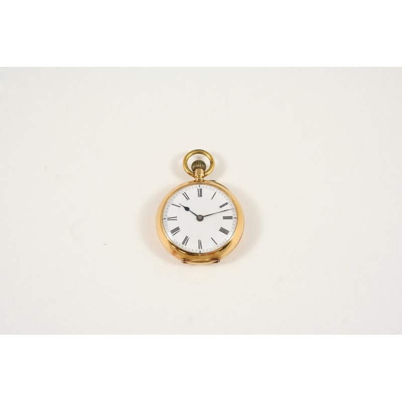 AN 18CT. GOLD OPEN FACED POCKET WATCH the white enamel dial with Roman numerals, 28mm. dia.