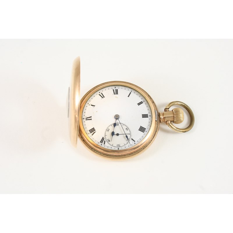 A GOLD PLATED HALF HUNTING CASED POCKET WATCH the white enamel dial with Roman numerals and subsidiary seconds dial, the movement signed Rolex Lever, 50mm. dia.