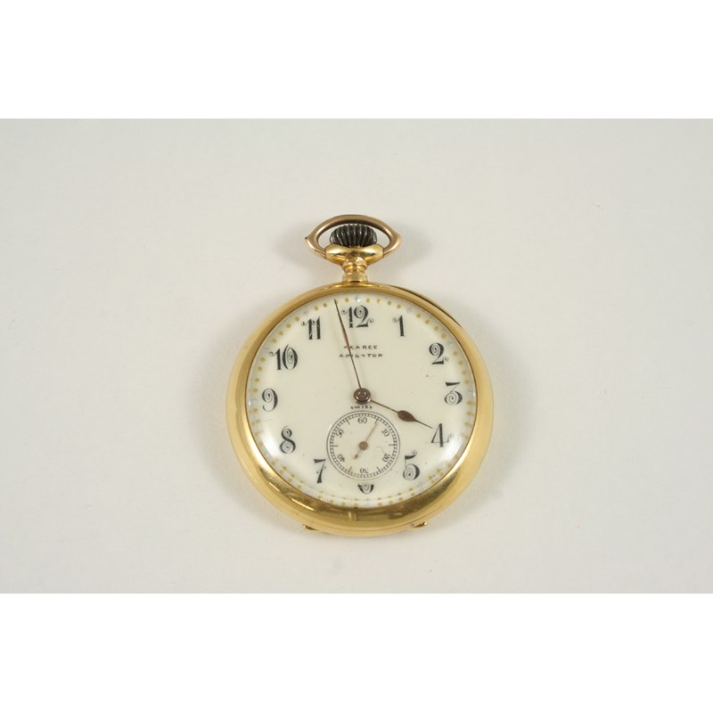 *AN 18CT. GOLD OPEN FACED POCKET WATCH the white enamel dial with Arabic numerals and subsidiary seconds dial, engraved with a monogram to the back case, 45mm. dia.